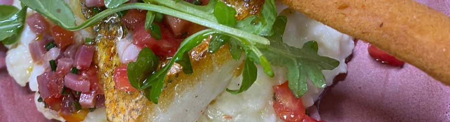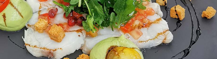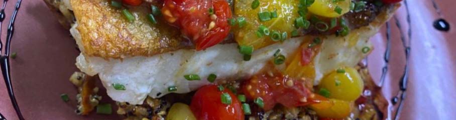 Dos de cabillaud juste snacké, vierge de tomates cerise au pistou, quinoa au chorizo