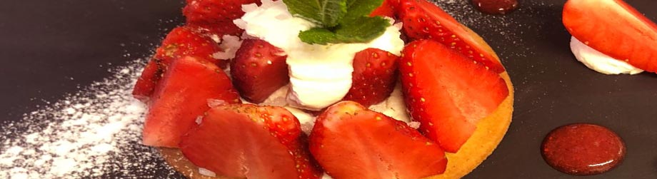 Les fraises de «Loustaou», mousse passion-mangue, gauffres.